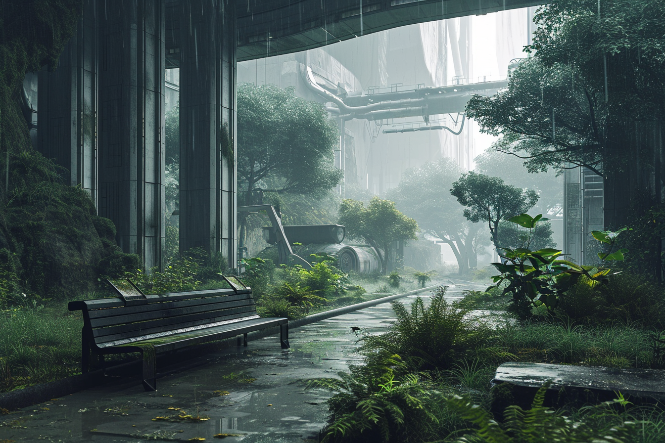 Midjourney prompt: a serene park adjacent to a busy offworld space port; rainy day scene; hyperdetailed photography, photorealistic. Canon EF 16-35mm f/2.8L III USM lens on a Canon EOS 5D Mark IV camera –ar 3:2 –v 6.0