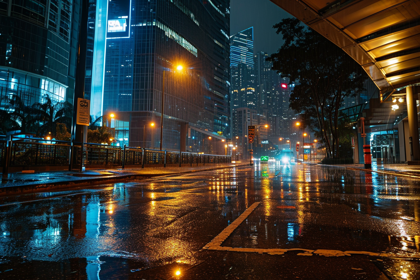 Midjourney prompt: a financial hub in a busy offworld spaceport; rainy night scene; city; eye level shot, Canon EF 16-35mm f/2.8L III USM lens on a Canon EOS 5D Mark IV camera –style raw –ar 3:2 –v 6.0