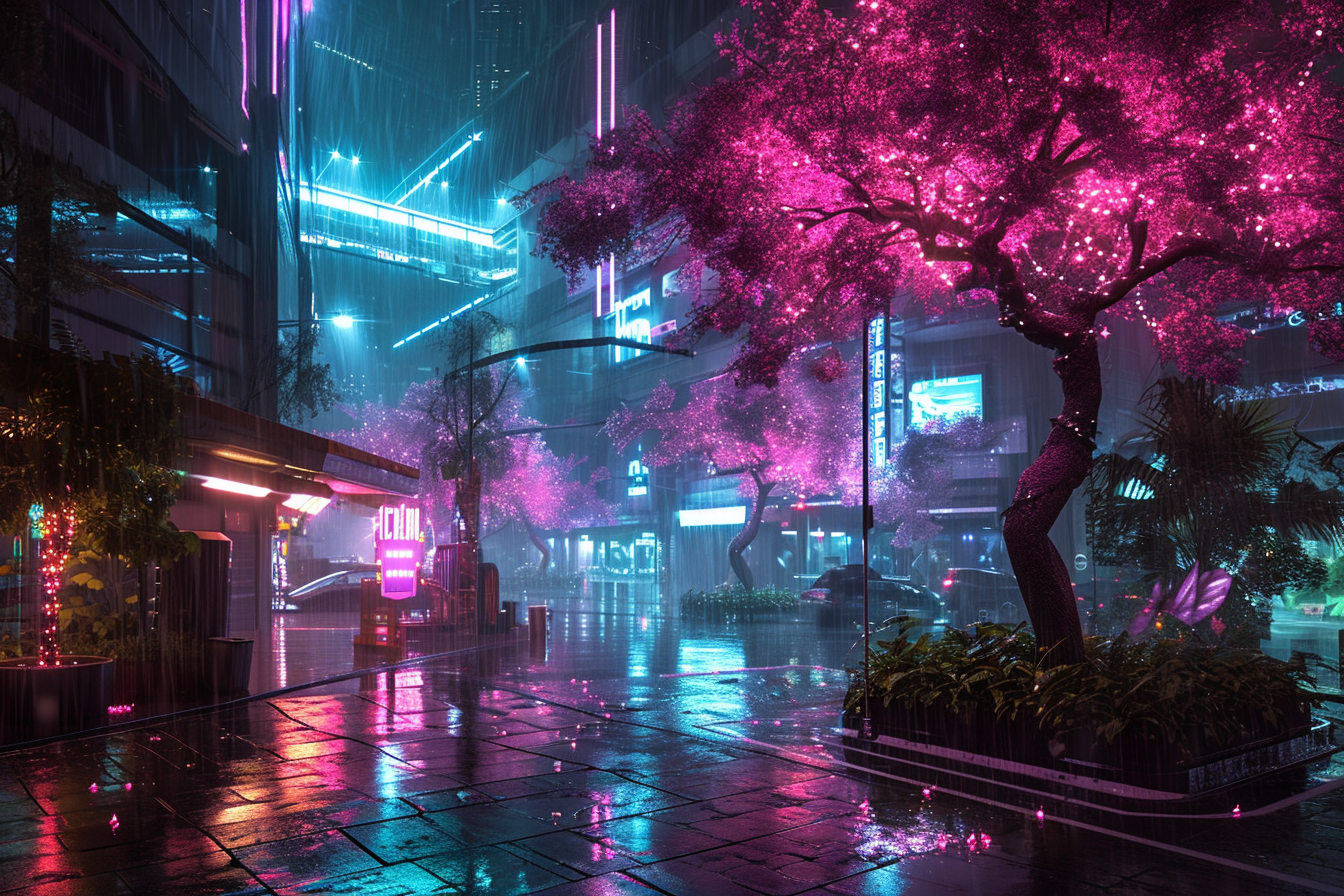 Midjourney prompt: glowing trees in an offworld spaceport district; rainy night scene; shops, neon lights; city; hyperdetailed photography, photorealistic. Canon EF 16-35mm f/2.8L III USM lens on a Canon EOS 5D Mark IV camera –ar 3:2 –v 6.0