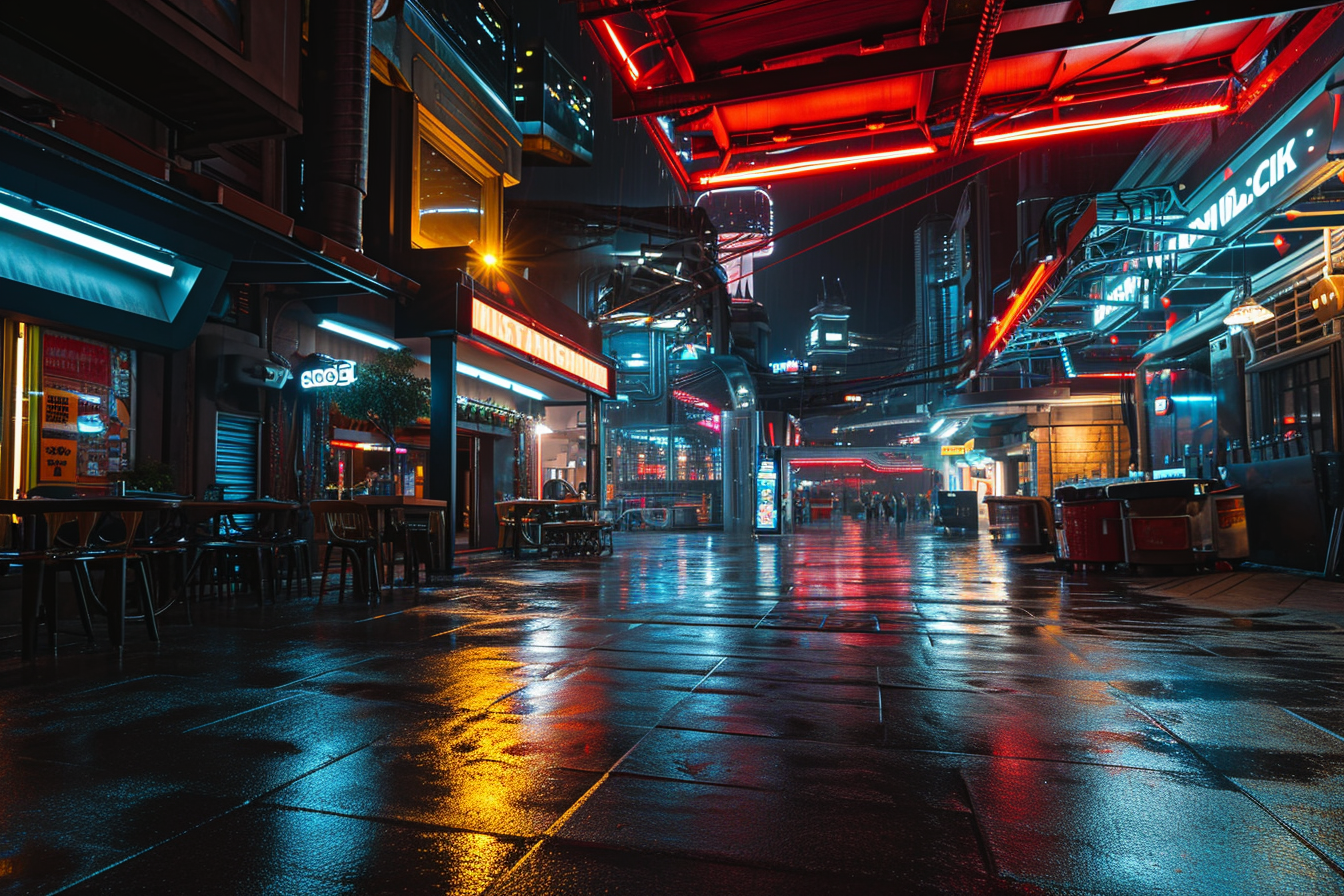 Midjourney prompt: boutique shops and restaurants in an offworld spaceport; drizzly outdoor night scene; city; busy; eye level shot. Canon EF 16-35mm f/2.8L III USM lens on a Canon EOS 5D Mark IV camera –ar 3:2 –v 6.0