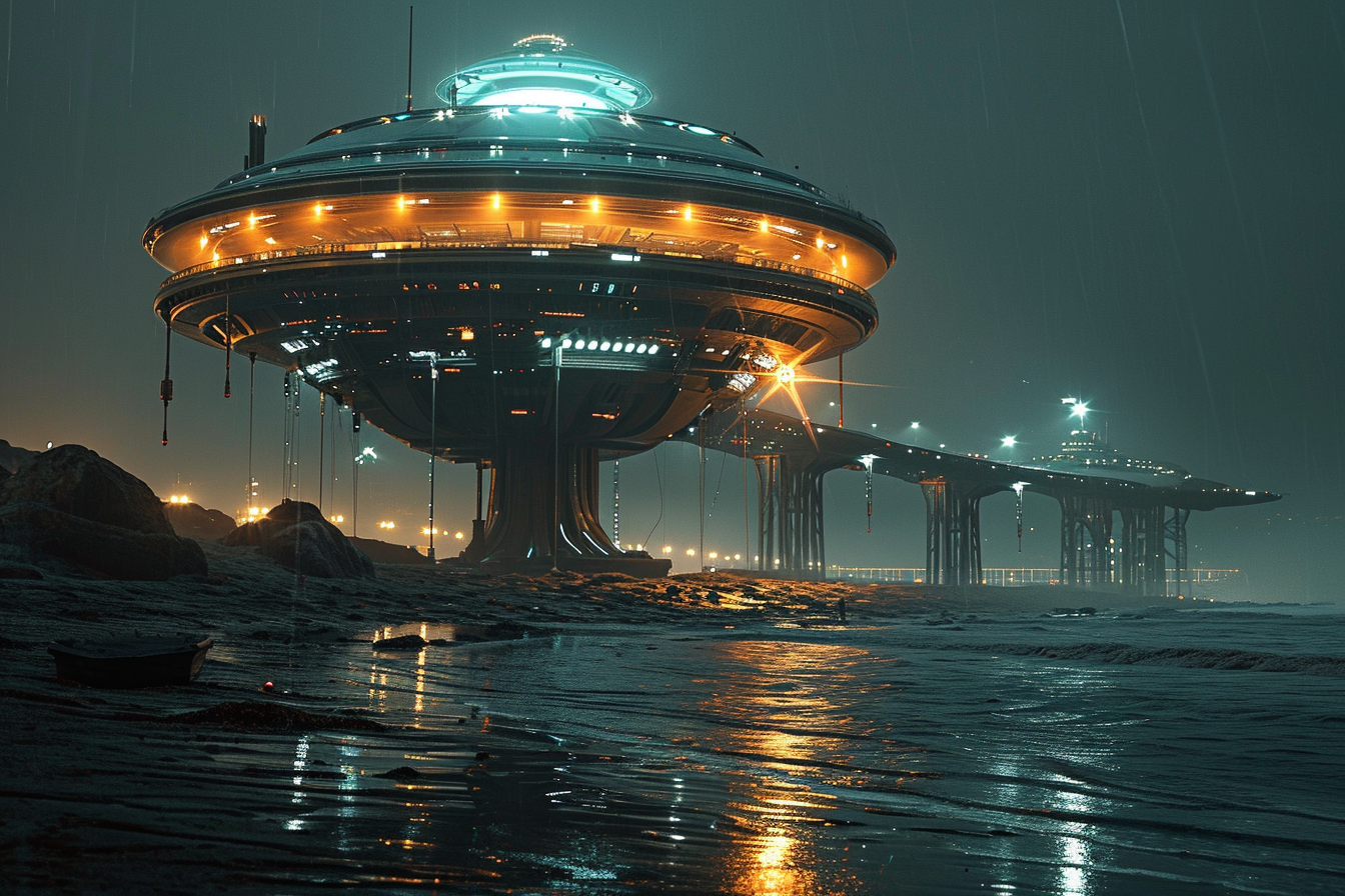 Midjourney prompt: a large offworld spaceport on a beach; night scene; city; eye level shot; Canon EF 16-35mm f/2.8L III USM lens on a Canon EOS 5D Mark IV camera –style raw –stylize 250 –ar 3:2 –v 6.0