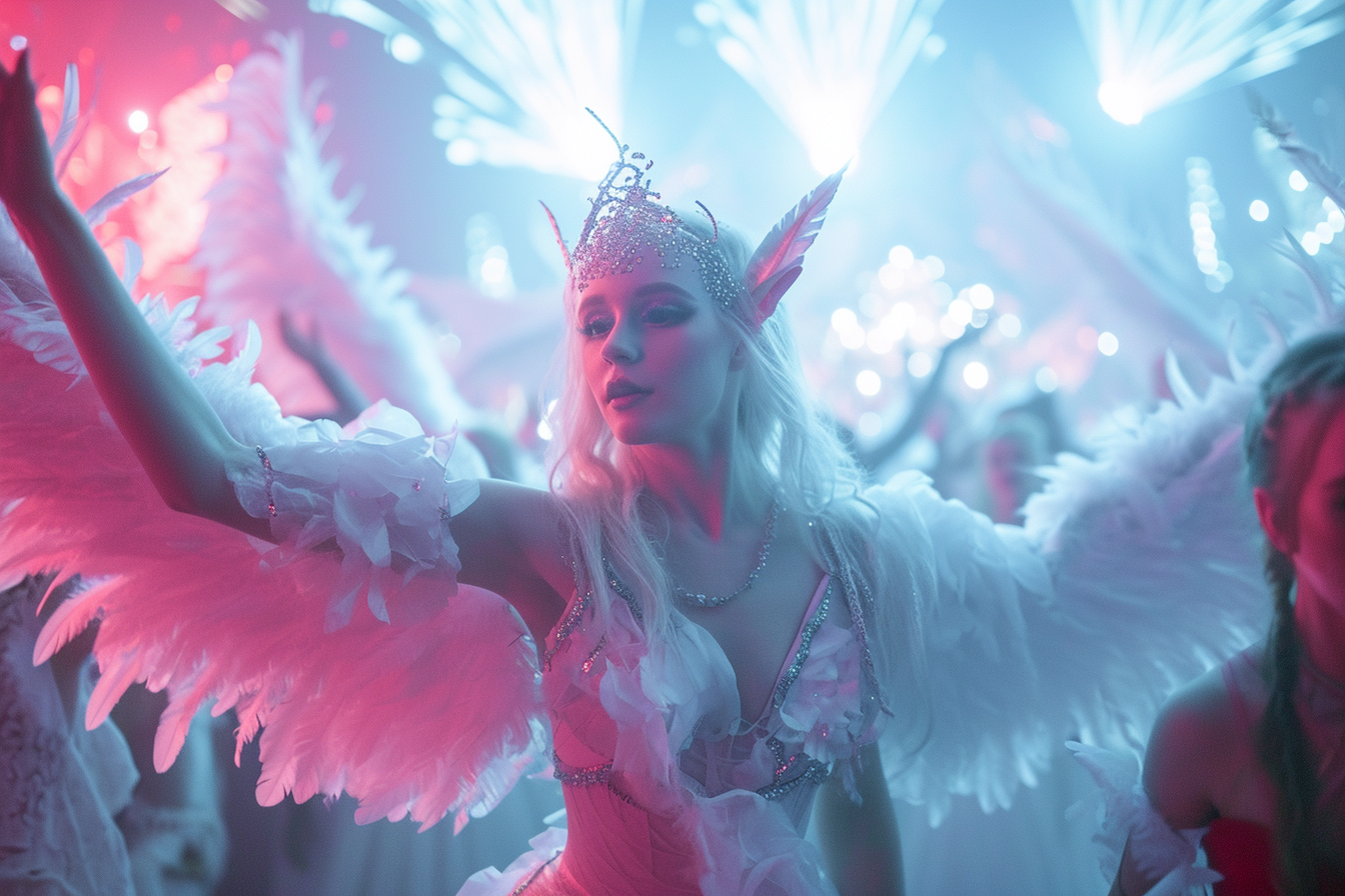 Midjourney prompt: winged aliens celebrating at a dance festival in a futuristic space ship; lithe. ethereal. elven ears. snow white skin, intricate flowing white dresses. tattooed; Canon EF 16-35mm f/2.8L III USM lens on a Canon EOS 5D Mark IV camera –ar 3:2 –style raw –stylize 250 –v 6