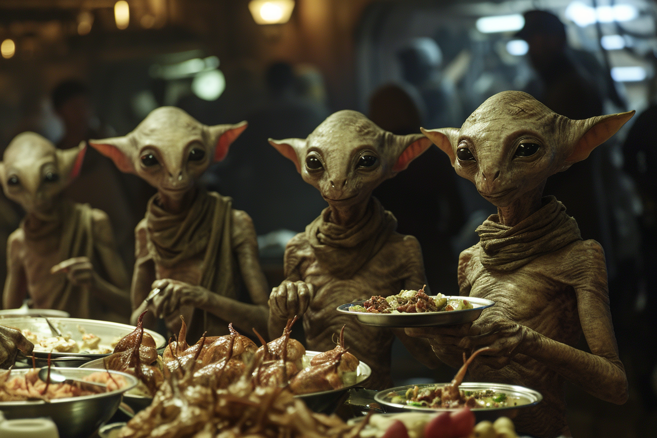 Midjourney prompt: many short aliens enjoy food from a large buffet table in an offworld night market; short shaggy fur. large black eyes. long, thin, pointed ears, short snouts, whiskers; work attire; portrait shot, Canon EF 16-35mm f/2.8L III USM lens on a Canon EOS 5D Mark IV camera –ar 3:2 –style raw –v 6