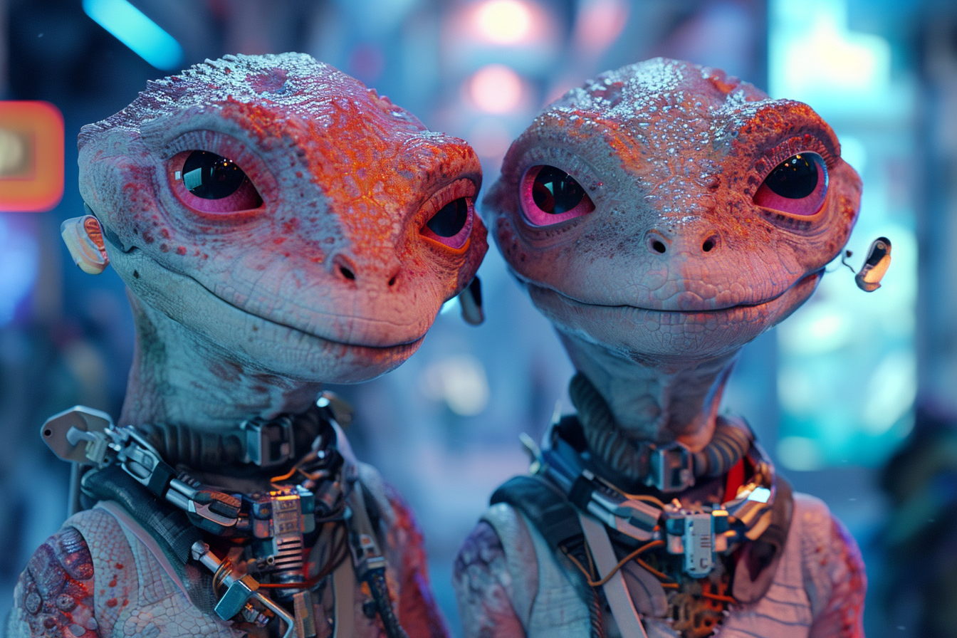Midjourney prompt: robotic reptilian aliens collaborating on a project in an offworld engineering bay; pink glowing eyes, narrow snouts, feminine; colorful high tech robotic components; dimly lit scene; closeup shot, 35mm f/2.8L –ar 3:2 –style raw –stylize 200 –v 6