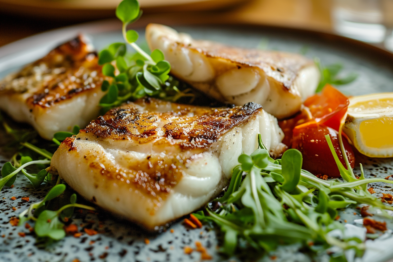 Midjourney prompt: grilled pieces of fish with a side of Zelphri herbs; fine offworld dining –ar 3:2 –style raw –v 6.0