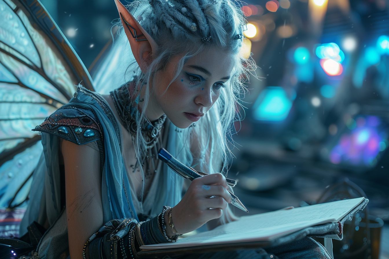 Arynn's slender figure is commonly adorned with a flowy, azure tunic that complements her delicate, membranous wings, tinted with a soft, seafoam green. Silver bracelets clink around her wrists, often heard before she's seen. Her hair, a cascade of lustrous silver, is usually tied back with a ribbon that mirrors the night sky. Always by her side is her dependable notepad, chronicled with the affairs and secrets of Elion, a tool as indispensable to her as her ability to fly.