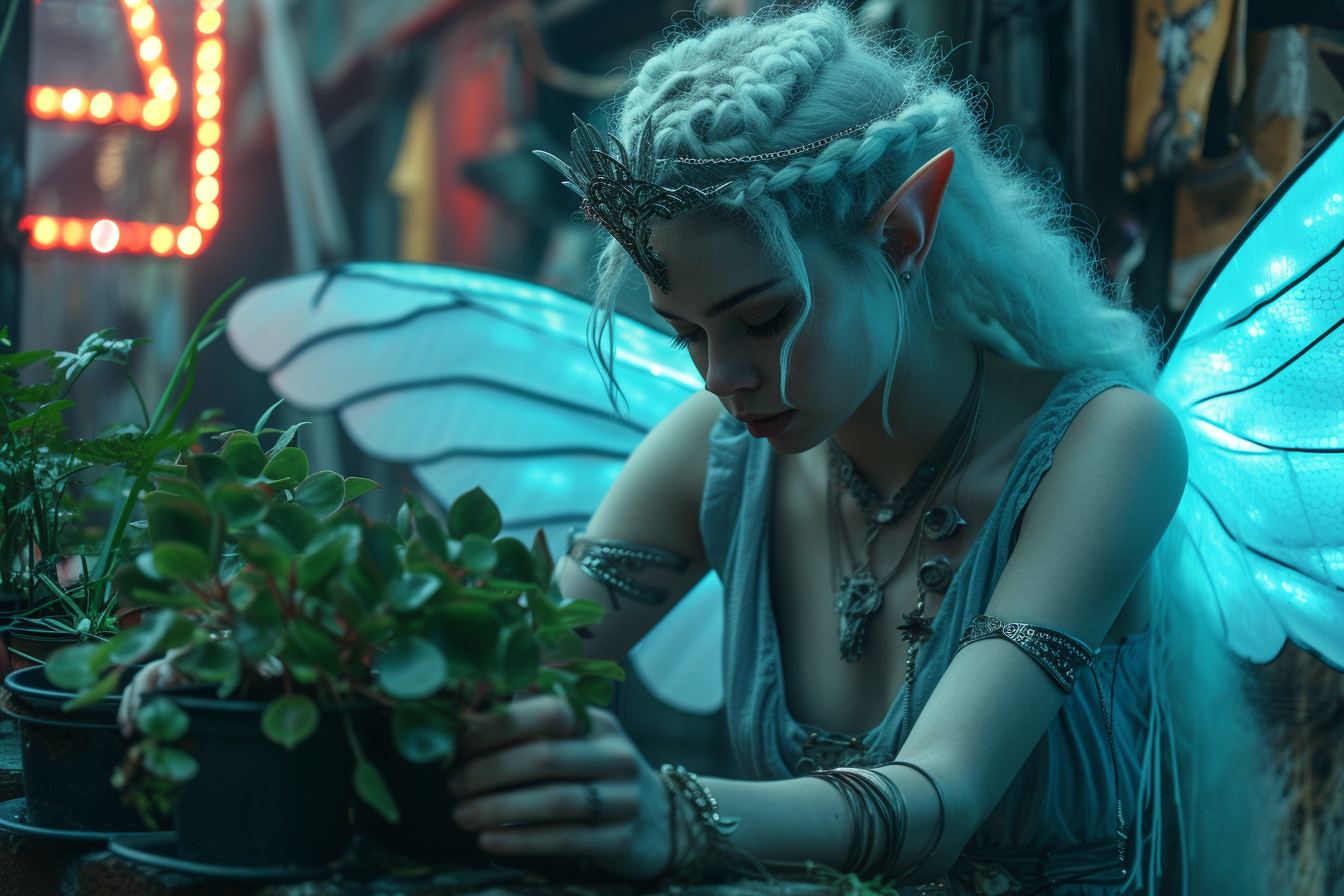 Midjourney prompt: a winged alien tends to plants on an apartment balcony. She is pale with snow white skin, elven ears, and large membranous wings. She wears a flowy blue tunic and many silver bracelets. her hair is tied with black ribbons. dimly lit scene in a futuristic city adorned with with glow of neon lights. Canon EF 16-35mm f/2.8L III USM lens on a Canon EOS 5D Mark IV camera –ar 3:2 –style raw –stylize 200 –v 6