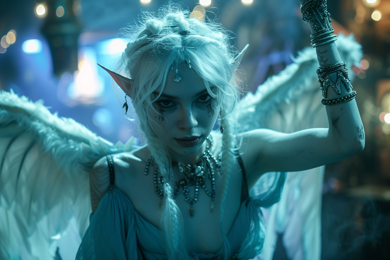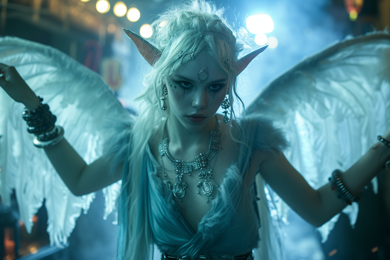 (Elanora Solara) Midjourney prompt: a winged alien playing a flute in an offworld street market; lithe. ethereal. elven ears. snow white skin, intricate flowing white dress. tattooed; dimly lit scene. blue and pink lighting. close-up shot. Canon EF 16-35mm f/2.8L III USM lens on a Canon EOS 5D Mark IV camera –ar 3:2 –style raw –stylize 200 –v 6