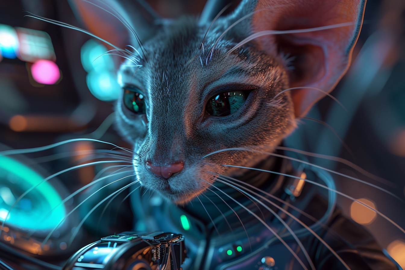 (Kiara Nevan) Midjourney prompt: an alien holding a gadget in an engineering bay on a starship. She has black and white fur, an elongated snout, long pointed ears, whiskers, and large green eyes with slitted pupils. She is wearing sleek blue attire adorned with gadgets. Canon EF 16-35mm f/2.8L III USM lens on a Canon EOS 5D Mark IV camera –ar 3:2 –stylize 200 –v 6