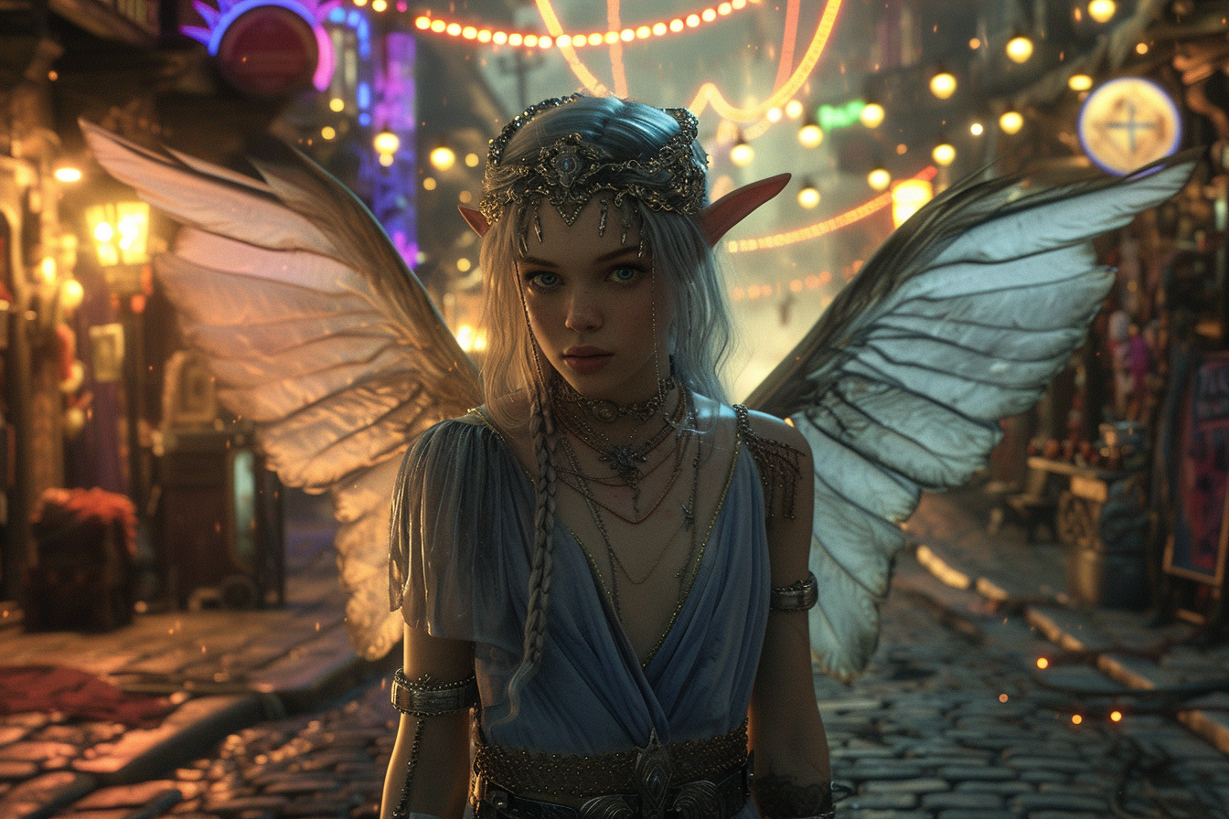 Midjourney prompt: a winged alien stands on a cobblestone street lined with shops and a lattice of lamplights. She is pale with snow white skin, elven ears, and large membranous wings. She wears a flowy blue tunic and many silver bracelets. her hair is tied with black ribbons. dimly lit scene in a futuristic city adorned with the colorful glow of neon lights. Canon EF 16-35mm f/2.8L III USM lens on a Canon EOS 5D Mark IV camera –ar 3:2 –style raw –stylize 200 –v 6