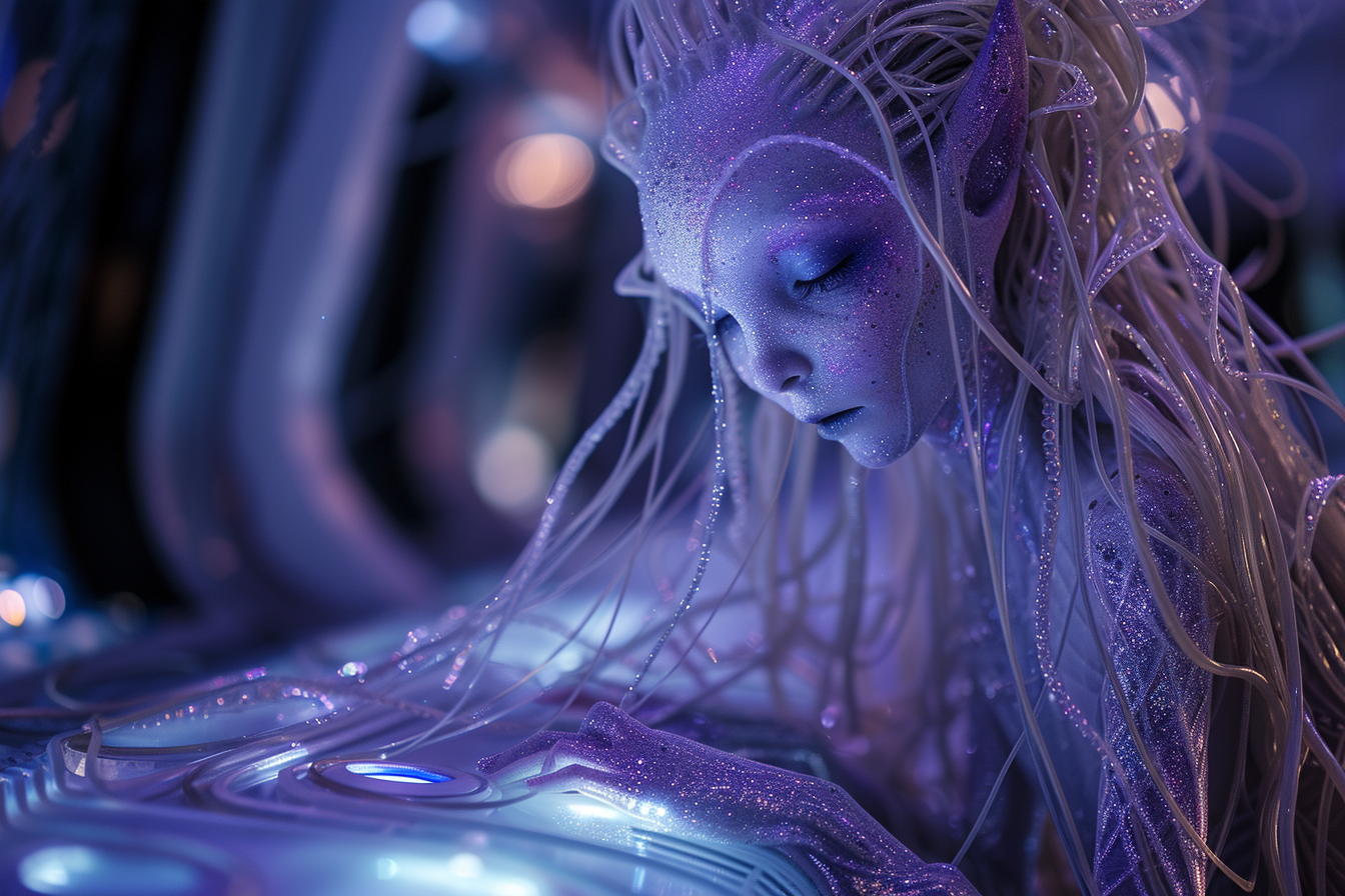 (Kael) Midjourney prompt: a biolumiescent alien on the bridge of a star ship. She is lithe and feminine, with long, thin tendrils instead of hair, pale purple skin covered in tendrils, and small elven ears. She wears a glittering gossamer gown. dimly lit scene. Canon EF 16-35mm f/2.8L III USM lens on a Canon EOS 5D Mark IV camera –ar 3:2 –stylize 200 –v 6
