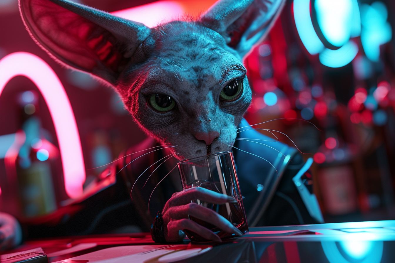 Arynn sat at the bar, swirling a luminescent cocktail, the colors shifting like the nebulae of her next story. The liquid light flickered in her eyes as the door slid open, admitting a figure whose presence seemed to cause a subtle but distinct ripple of recognition throughout the room.